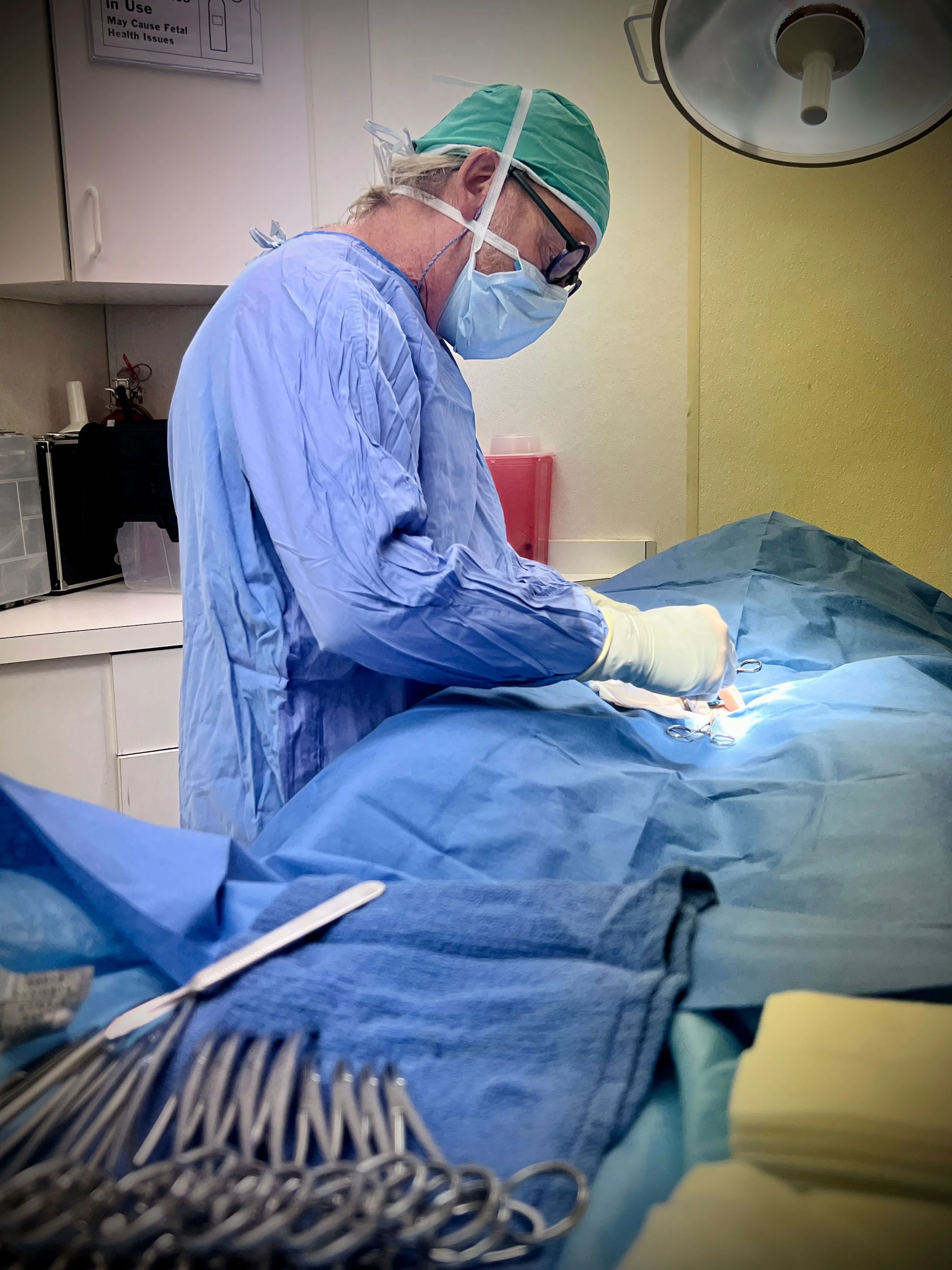 Surgery at VCB is performed only by Veterinarians. However, the surgeon is never without the help of at least one other trained surgical assistant. The surgeon operates only after scrubbing and donning a cap, gown, mask, and sterile gloves. Surgery is performed using sterile technique in a sterile surgical field. To aide the surgeon, the patient is illuminated by special halogen low-heat surgical lighting. All surgical instruments are sterilized by steam autoclave and are double wrapped according to AAHA standards. Patients are closely monitored for several hours after waking up from anesthesia. The utmost care is taken by the entire staff to provide your pet the greatest possible safety and chances for a healthy, comfortable recovery.